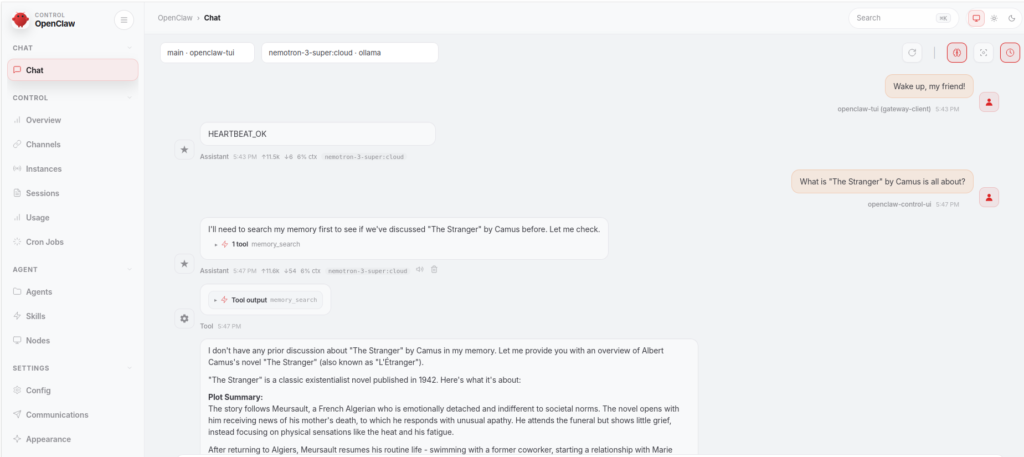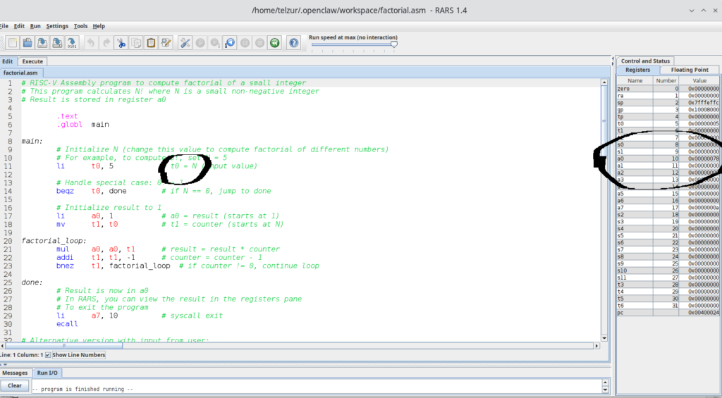Then I asked Openclaw to “write a RISC-V assembly code to be executed on the RARS simulator that computes the factorial N of a small integer”. it took a very long time to generate the code that was finally created under the workspace folder. The code ran smoothly on RARS. The factorial of 5, or 5!, is 120 or 0x78 and can be verified in the simulator for register a0:
