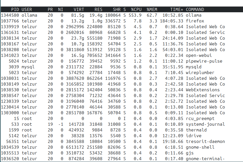 Note that the GPU is doing computing (C) and not graphics (G) for ollama and it uses approximately 6 GB of VRAM. In addition it uses the CPU as can be seen in “top”: