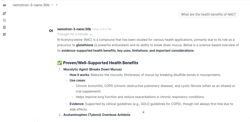 Running Nemotron-3-nano:30b on my laptop seems to be very impressive because it is a serious, quite large LLM which, makes an effective use of gaming laptop hardware (core i9, 32GB RAM and RTX4060 GPU with 8GB VRAM). As was shown above the CPU/GPU utilization was automatically set to: 77%/23% CPU/GPU. For a total memory of 26 GB which means using about 20GB RAM and about 6GB VRAM.