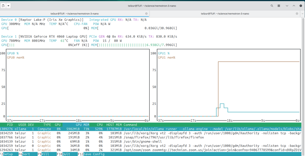 While the computer was processing the query the GPU load can be seen with “nvtop”: